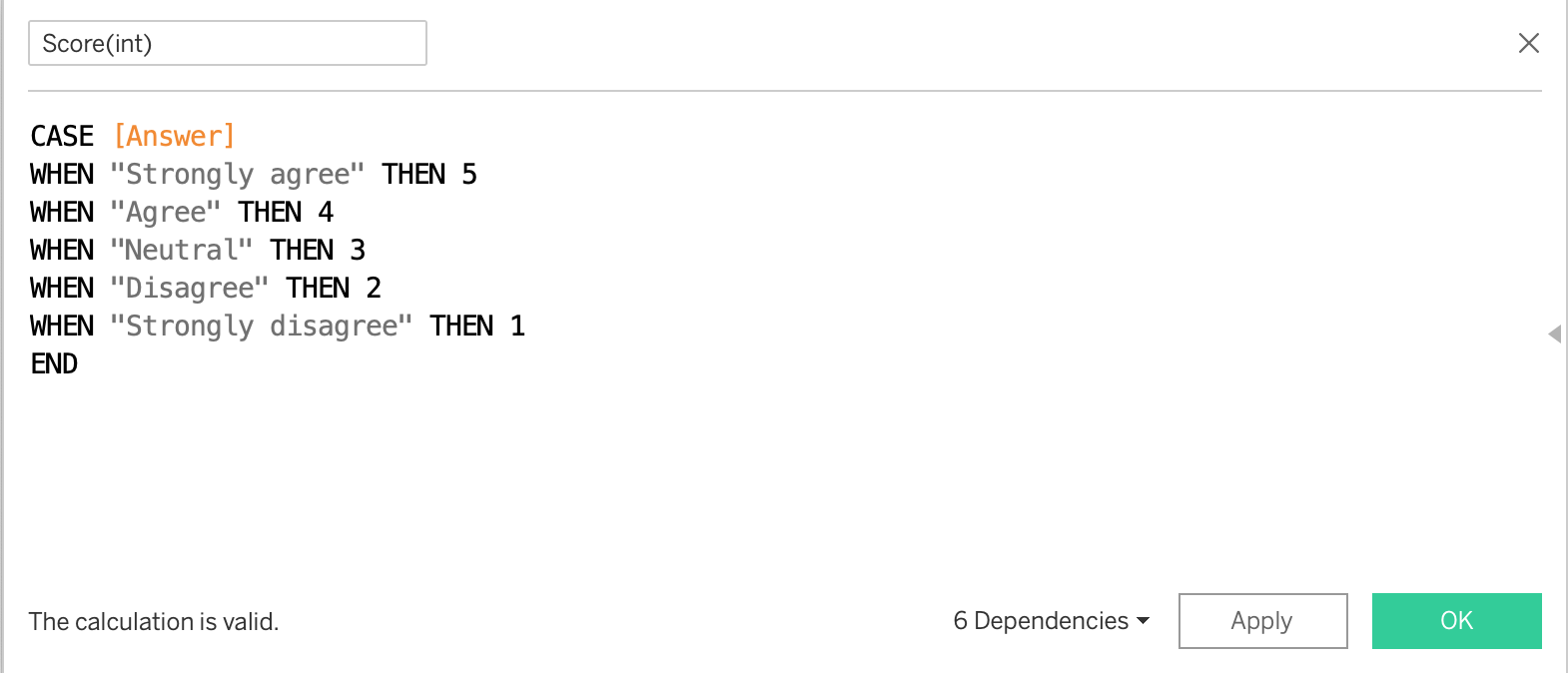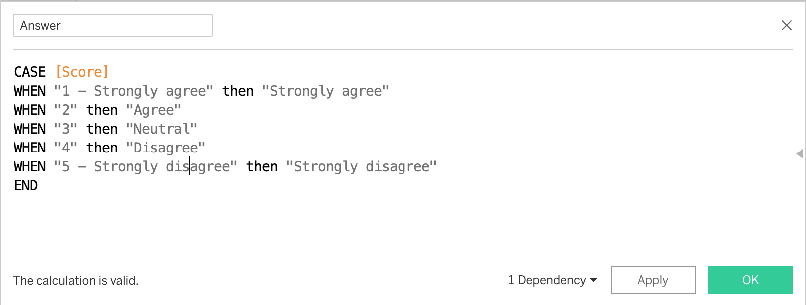 IF [Answer]=“Strongly agree” THEN [CNT] ELSE 0 END