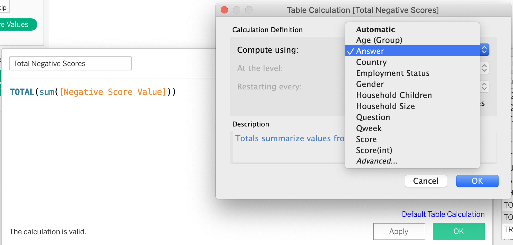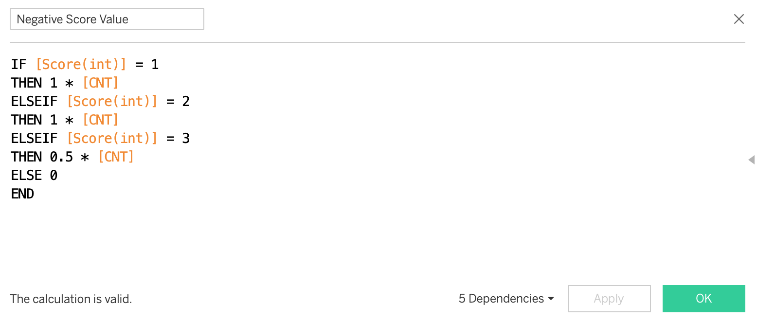 Create “Negative Score Values” field, using “created calculated field” function. Note that you should use CNT to calculate the whole number of respondents.