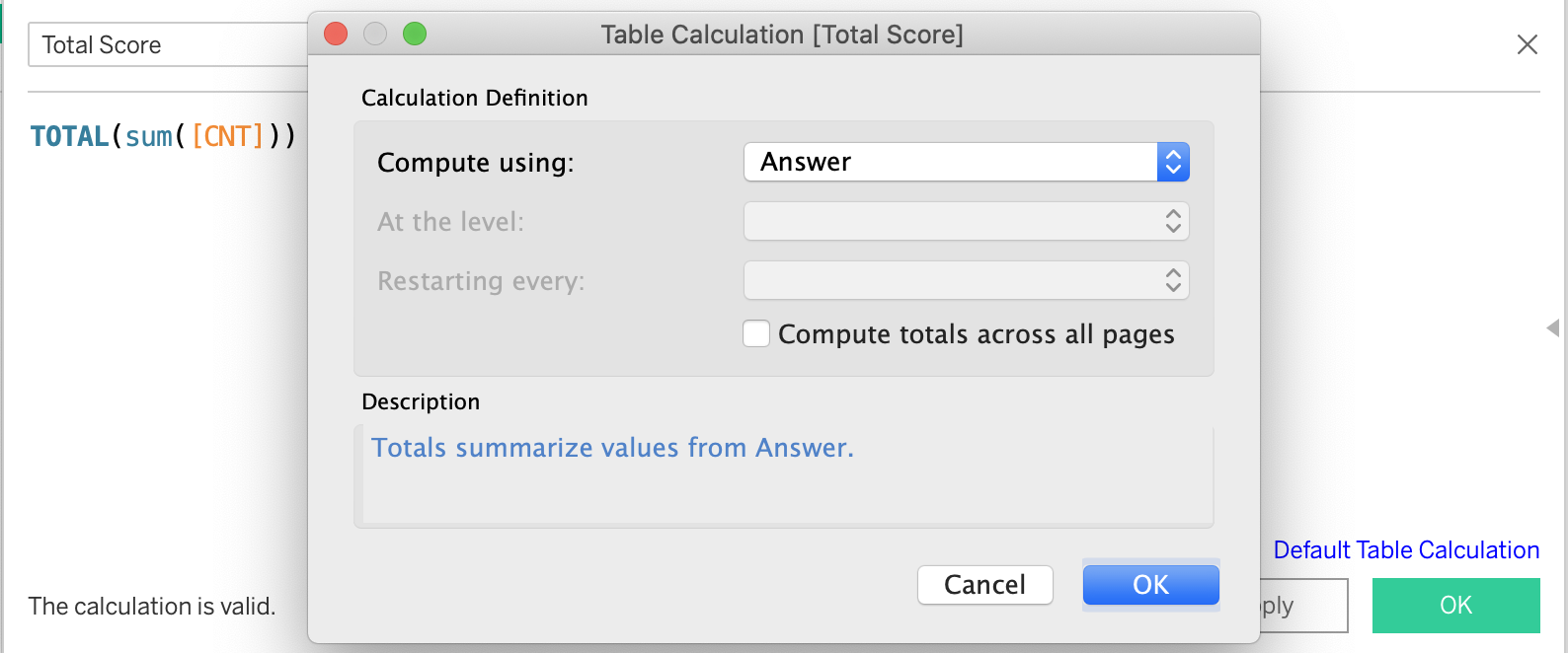 Create “Total Score” field using “created calculated field” function and click “Default Table Calculation” then change Compute using to “Answer”.