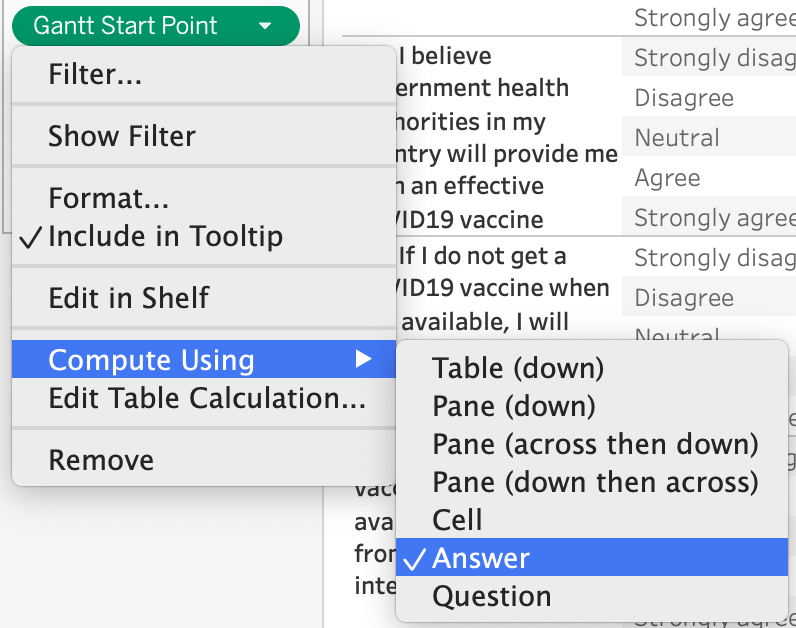 Drag and drop “Question” field into “Filter” pane and change the Marks to “Gantt Bar”. Lastly, Drag and drop “Percentage” field onto “Size” button to show the percentage of respondents.