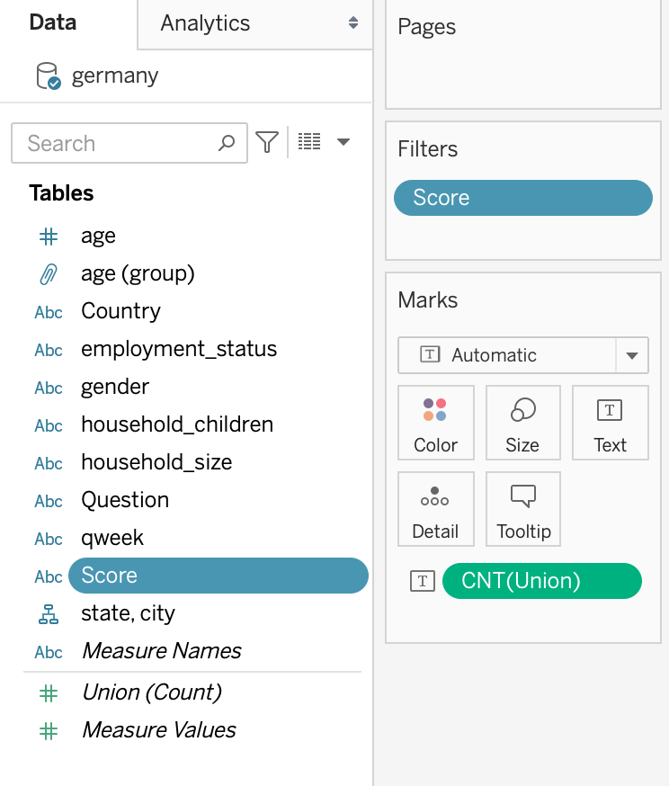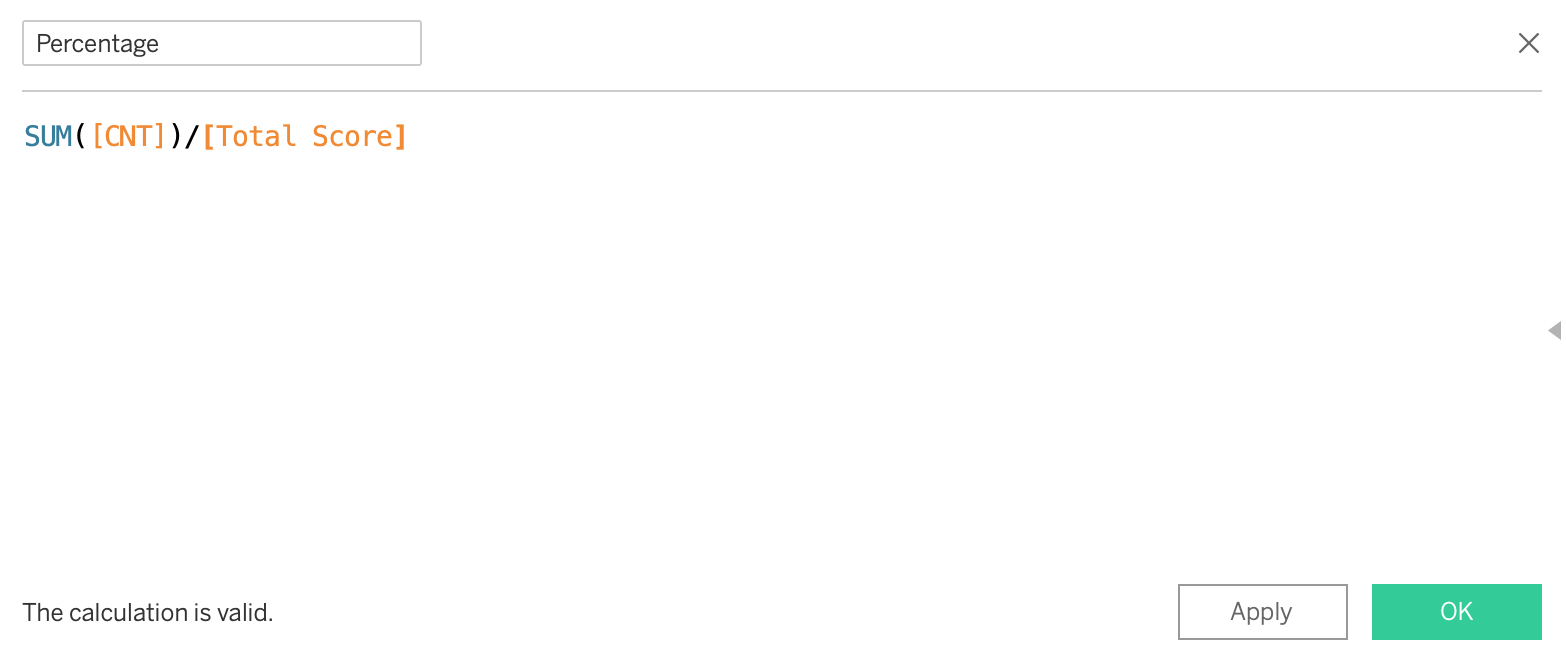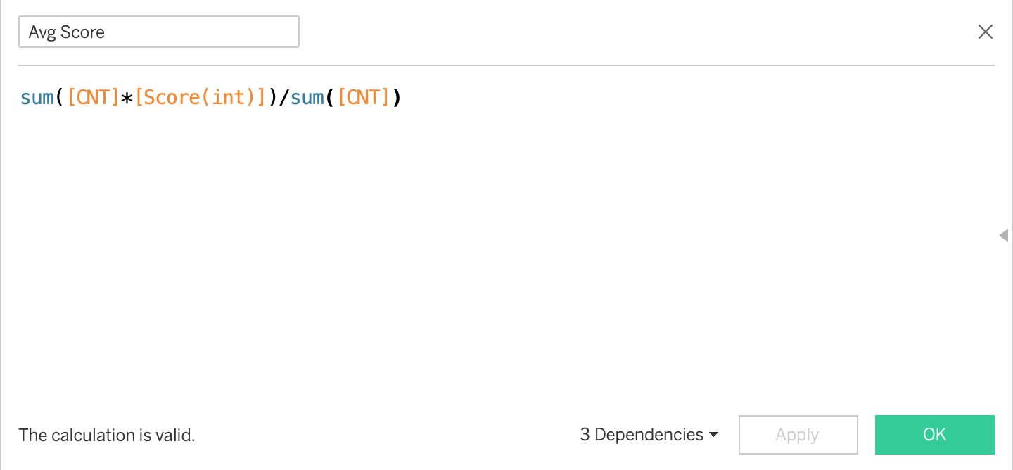 Create “Avg Score” field using “created calculated field” function. Note that you should use “CNT” field to calculate sum of respondents.