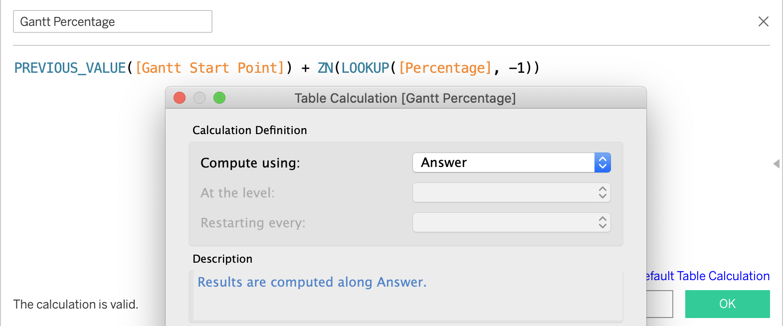 Create “Gantt Percentage” field using “created calculated field” function and click “Default Table Calculation” then change Compute using to “Answer”.