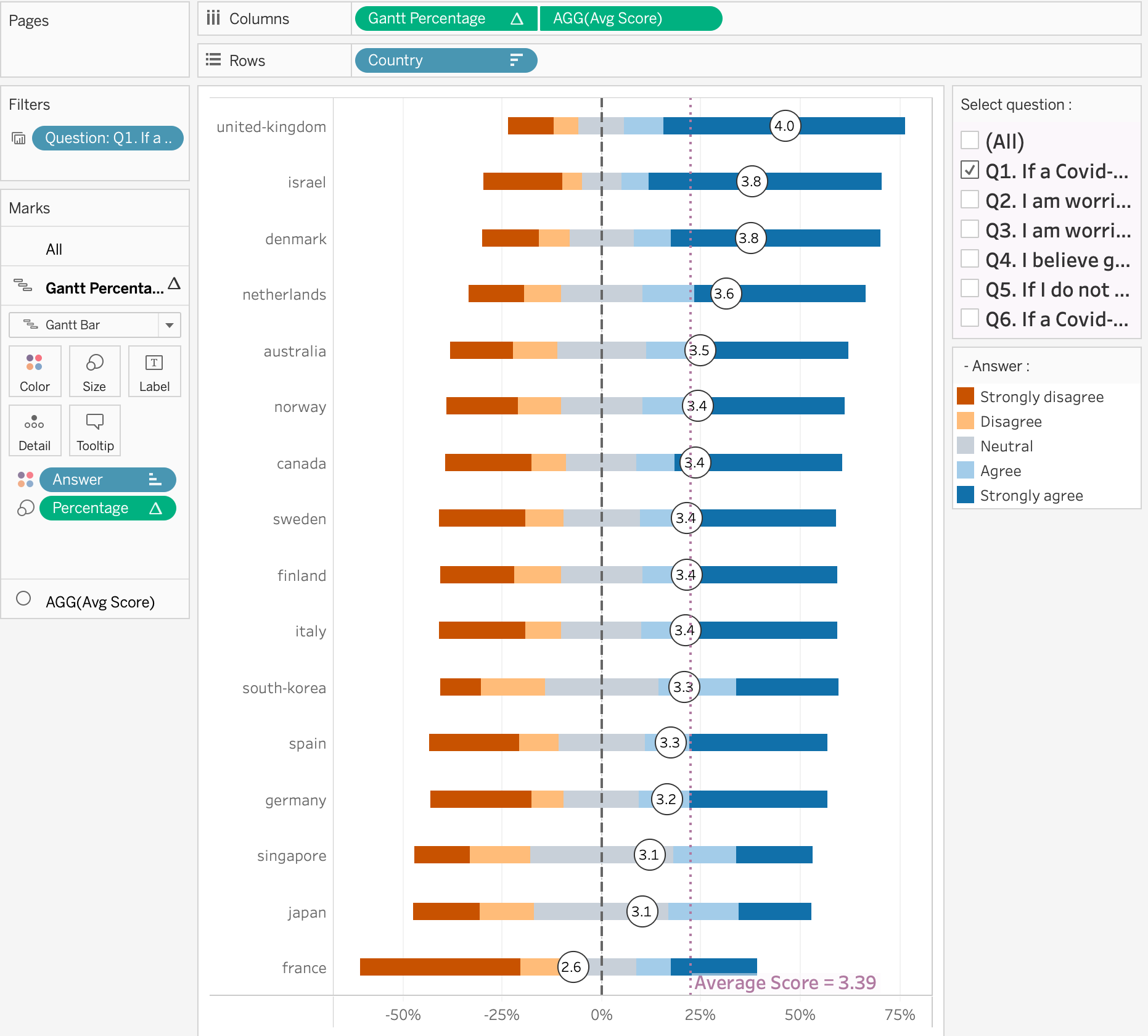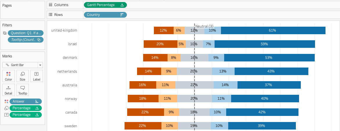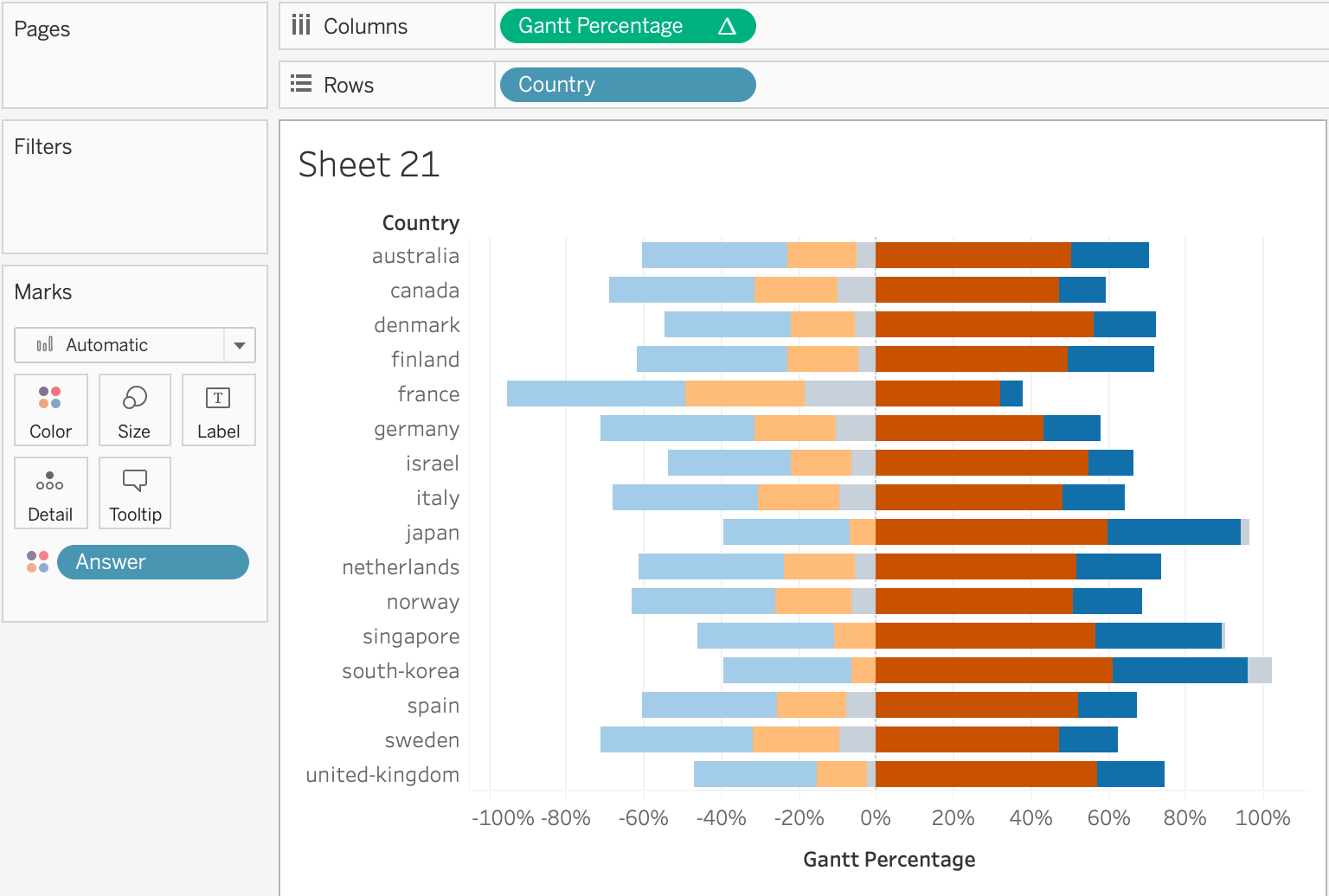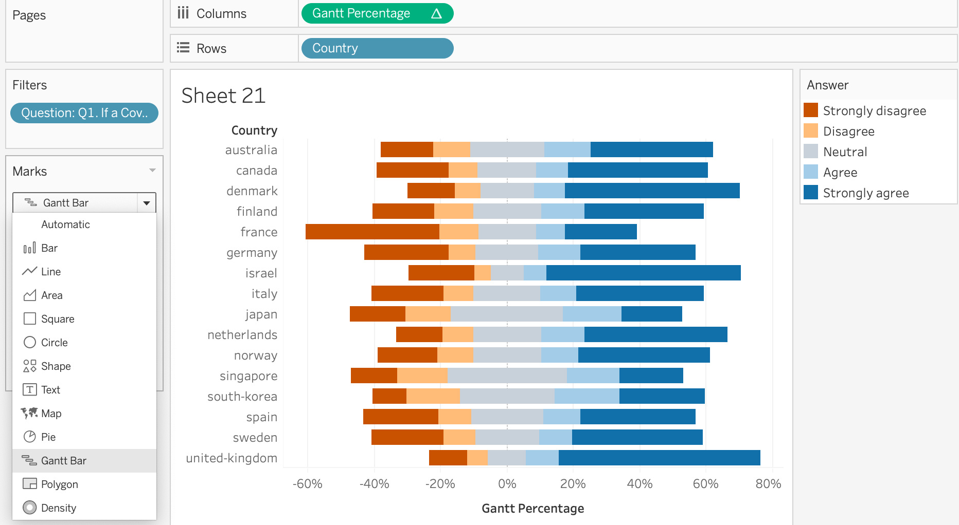 Drag and drop “Gantt Percetage” field into Columns and “Country” into Rows. Also Drag and drop “Answer”.