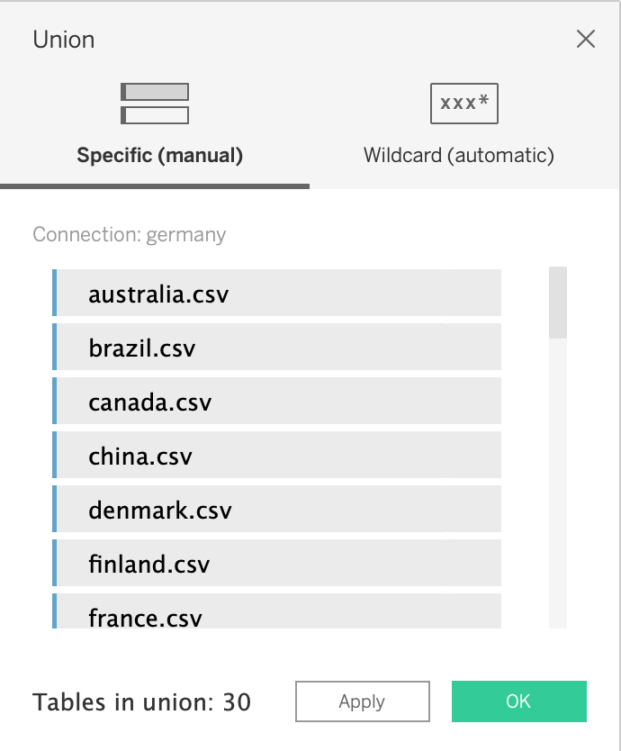 In order to union all the 30 individual country csv files, you need to remove pre-set data set(germany.csv). Then, drag and drop “New Union” to the pane. Next, select all the csv files on the next and drag into the dialog box.