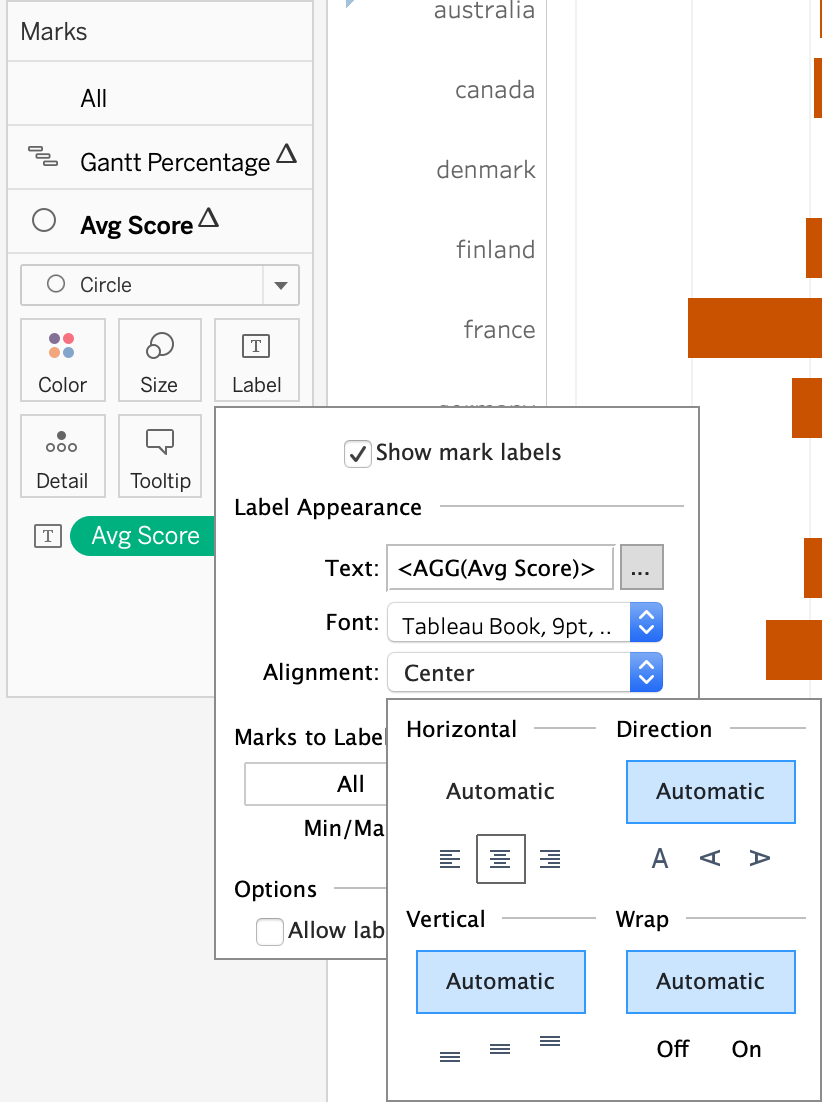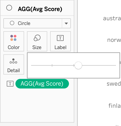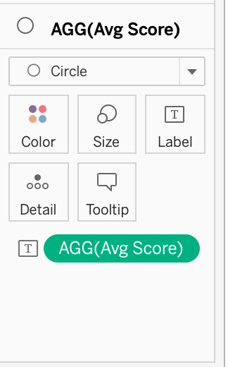 Chage Marks to “Circle” and drag and drop “Avg Score” onto “Label” button. Then click and change “Compute using” to cell