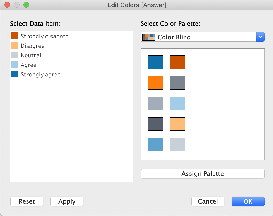 This chart used 5 different color to show the proportion of each answer. However, the colors are not consistent to show the scale of answers. We need to use the color scheme wisely, grouping the similar sentiment