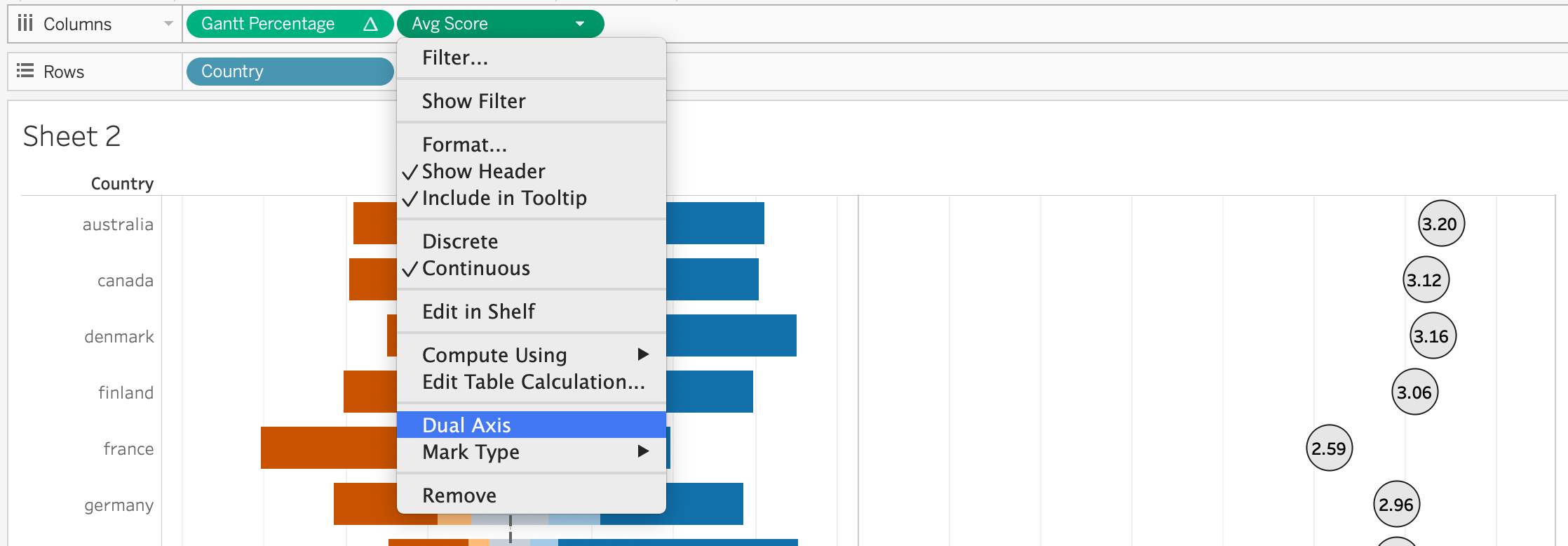 Click “Avg Score” in Columns and check “Dual Axis”