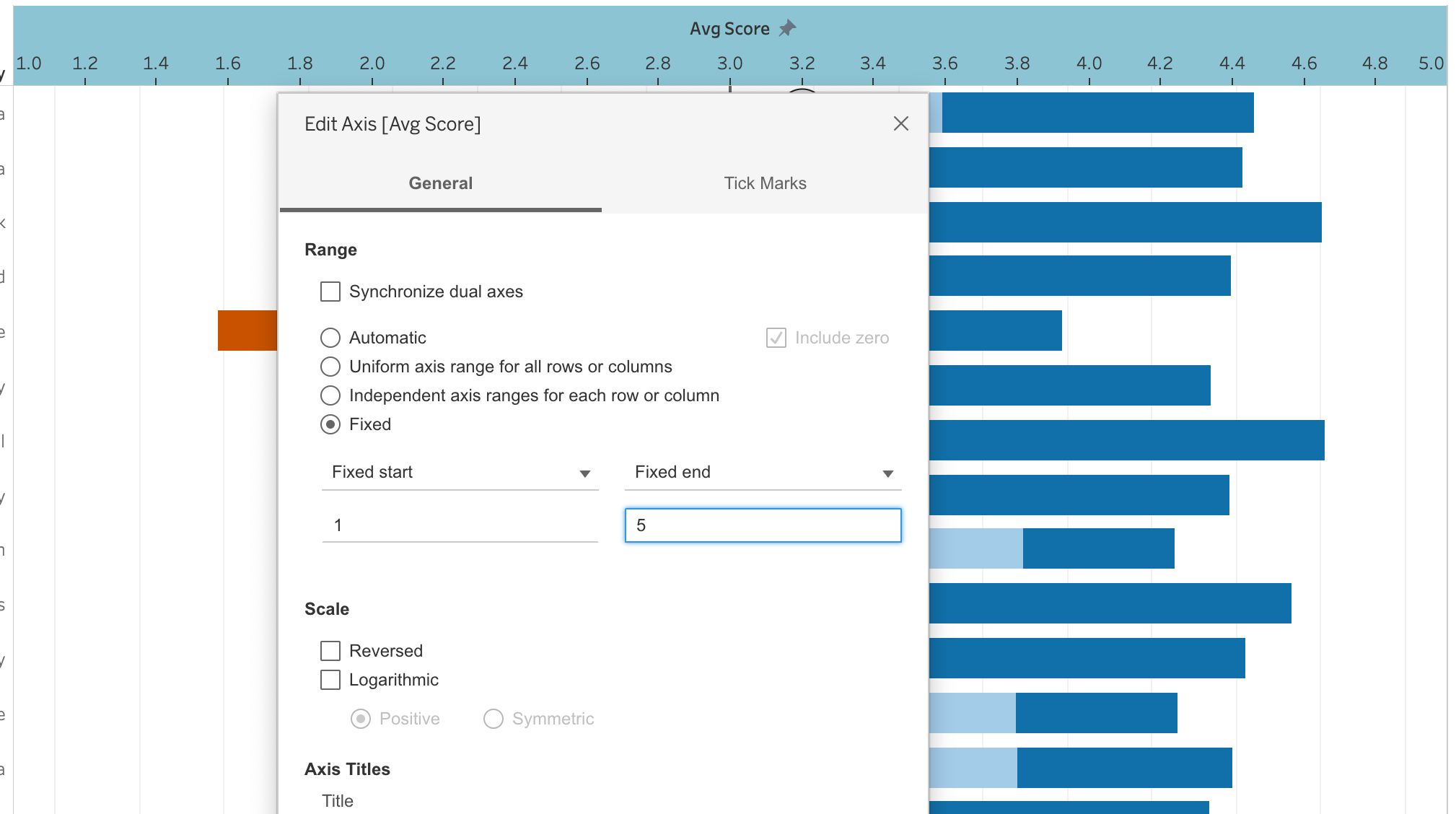 Right click above axis and click “Edit axis”. Check “Fixed” range for changing the range of axis from 1 to 5