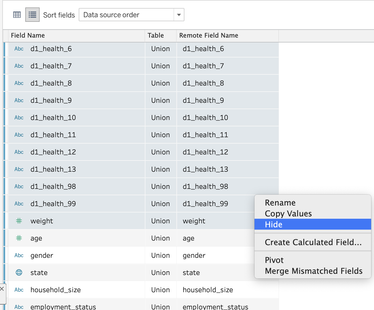 For the purpose of the analysis, we need to hide unnecessary fields first. Click “Manage Metadata” button then select unnecessary fields. Next, right click and hit “Hide”. Leave required fields only as below.
