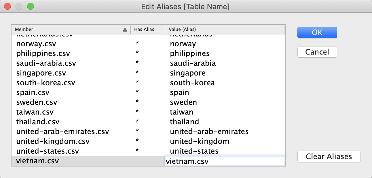 Change name of field of “Table Name” to “Country”. Then click “Aliases” and exclude ‘.csv’. in all Values on the right side.