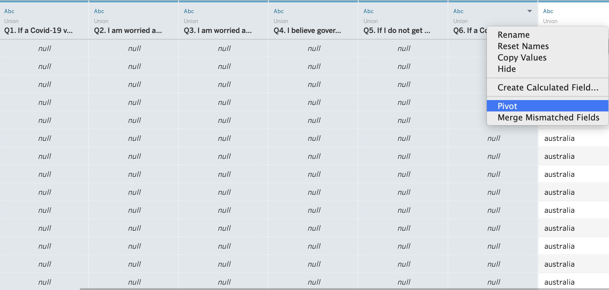 After changing all the name of fields regarding questions, select all the six question fields and right click to pivot the values.