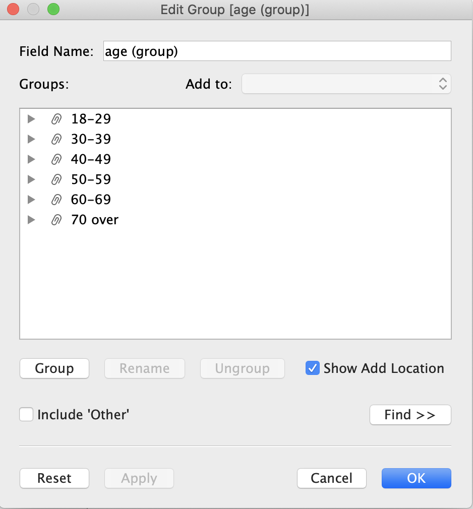 Click “Create Group..” in “Age” field. Select all the age instances that you want to group and click “Group” button.