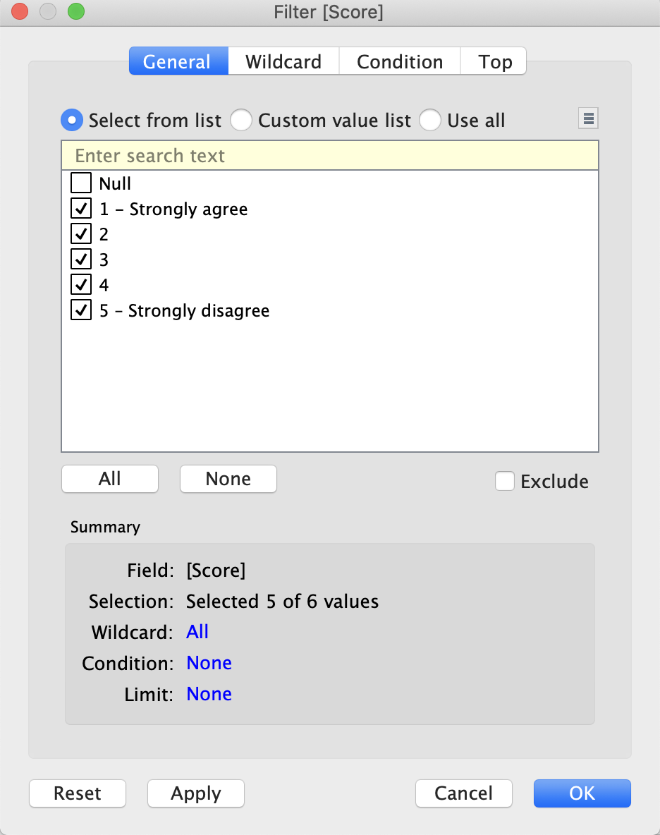 Go to Sheet1 and drag and drop “Score” into “Filters” pane. Un-check Null values in Score because the values are not necessary to visualise.