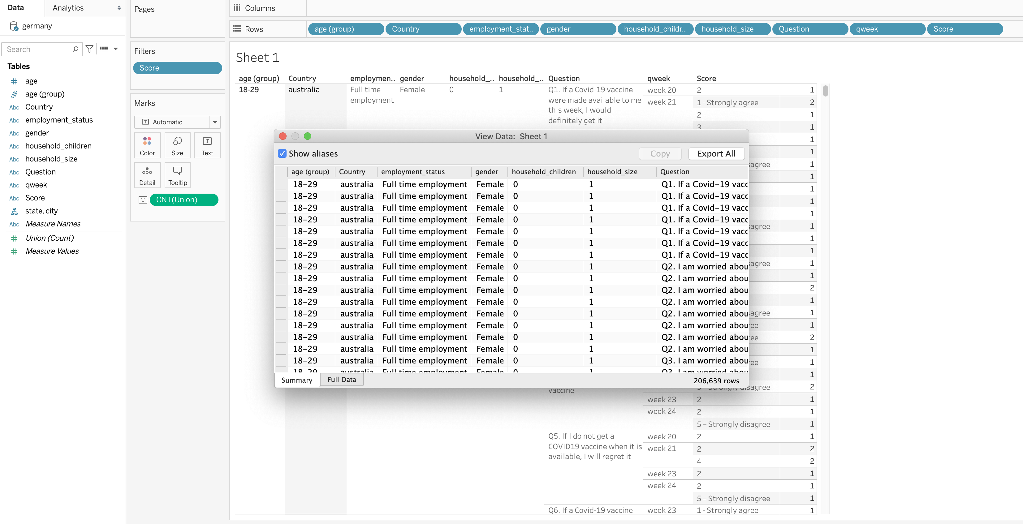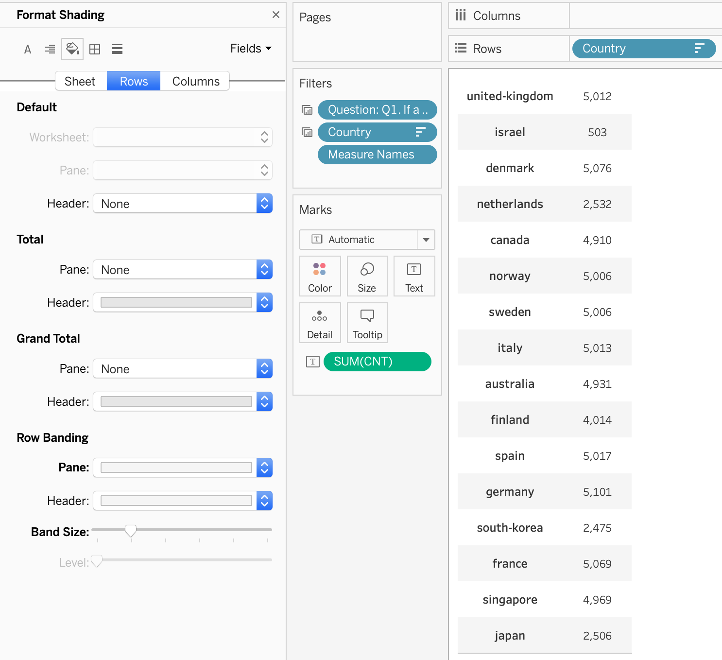Create a new worksheet for showing total number of respondents by country. Drag and drop “Country” field into Rows and “CNT” onto “Label” button. Also change the color shading to make clearer.