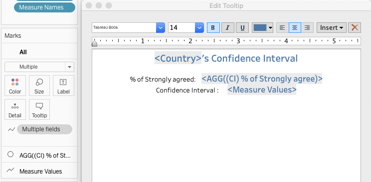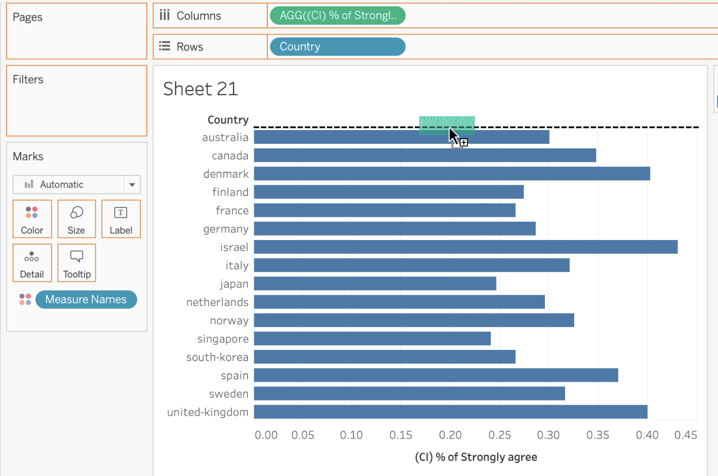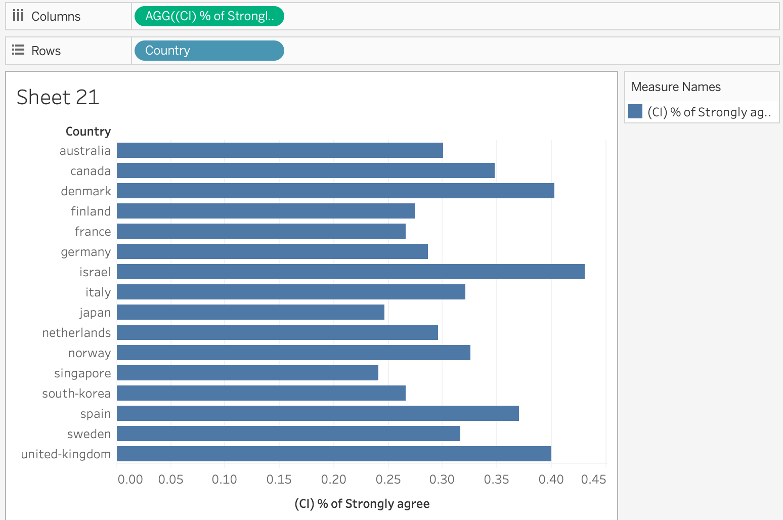 Drag and drop “(CI) % of Strongly agree” field into Columns and “Country” into Rows