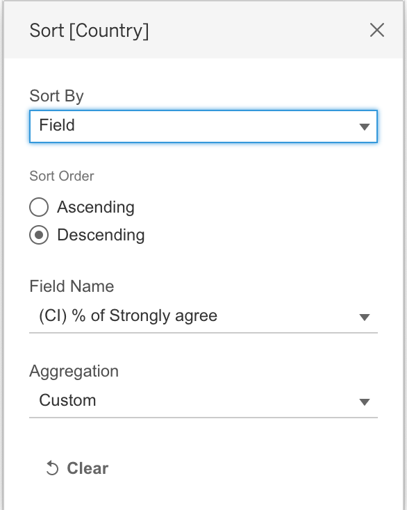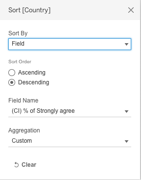 Click “Contry” in Rows and check “Sort” to sort Descending order by “(CI) % of Strongly agree”.