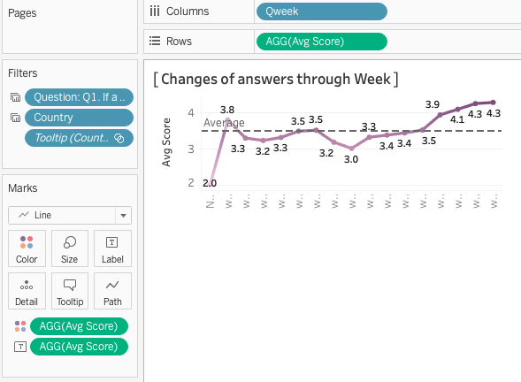Drag and drop “Qweek” into Columns and “Avg Score” into Rows. In order to show the figures, put “Avg Score” onto “Color” and “Label” button in Marks