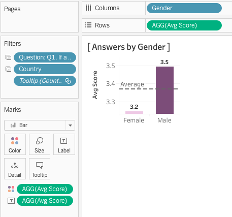 Drag and drop “Gender” into Columns and “Avg Score” into Rows. In order to show the figures, put “Avg Score” onto “Color” and “Label” button in Marks.