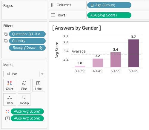 Drag and drop “Age (Group)” into Columns and “Avg Score” into Rows. In order to show the figures, put “Avg Score” onto “Color” and “Label” button in Marks.