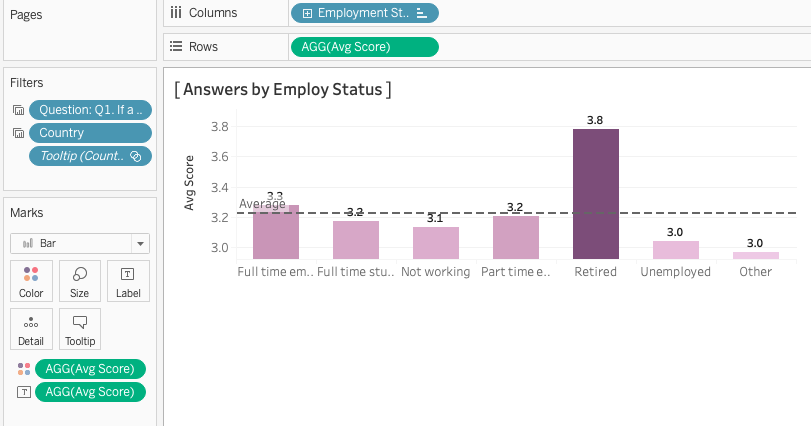Drag and drop “Employ Status” into Columns and “Avg Score” into Rows. In order to show the figures, put “Avg Score” onto “Color” and “Label” button in Marks.