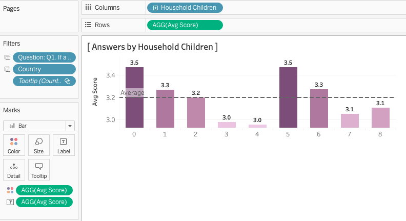 Drag and drop “Household Children” into Columns and “Avg Score” into Rows. In order to show the figures, put “Avg Score” onto “Color” and “Label” button in Marks.
