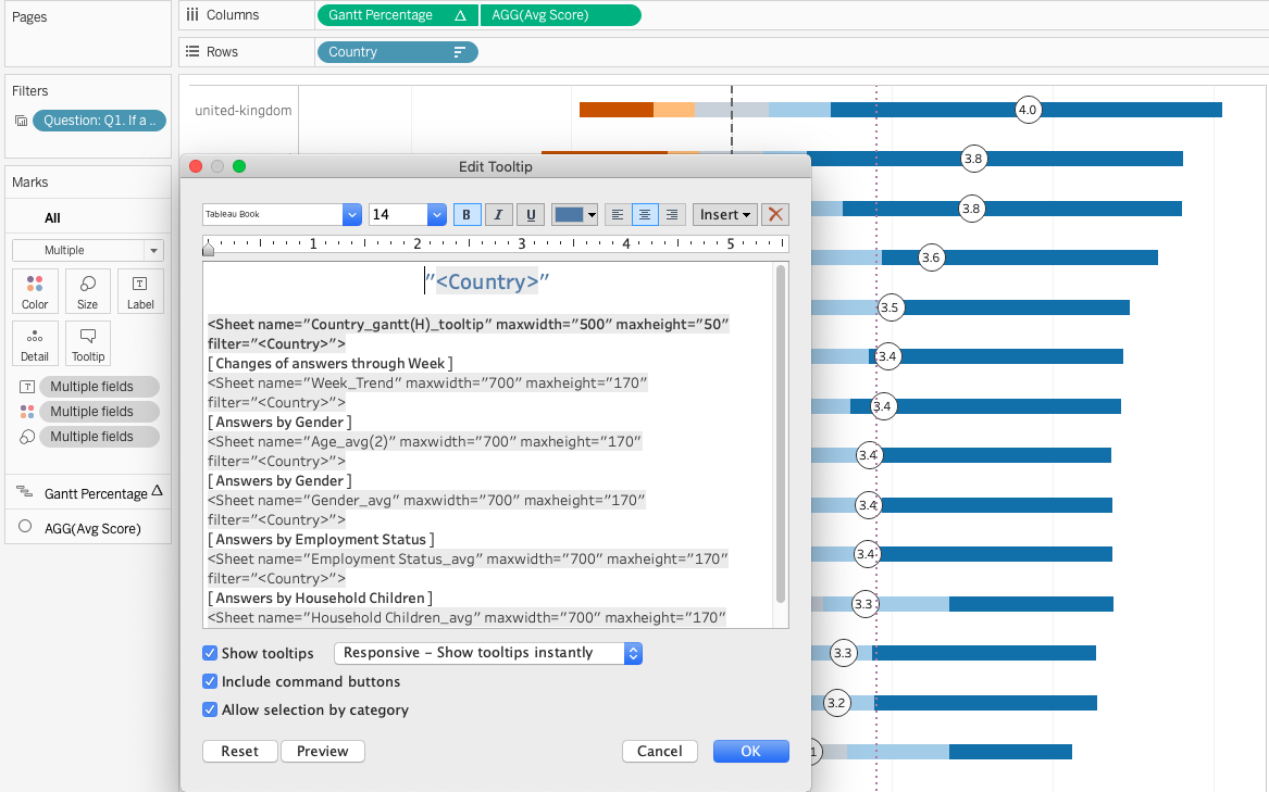 Go back to “Country_gantt chart” worksheet we made ealier, and click Tooltip button in “Marks” > “All”