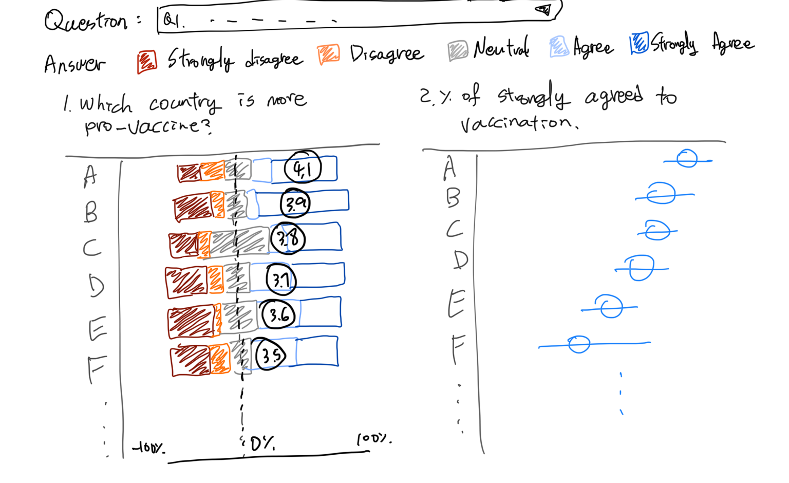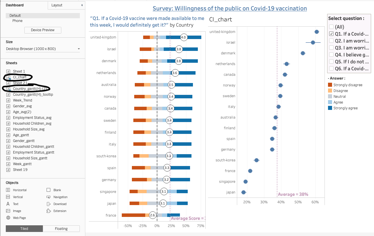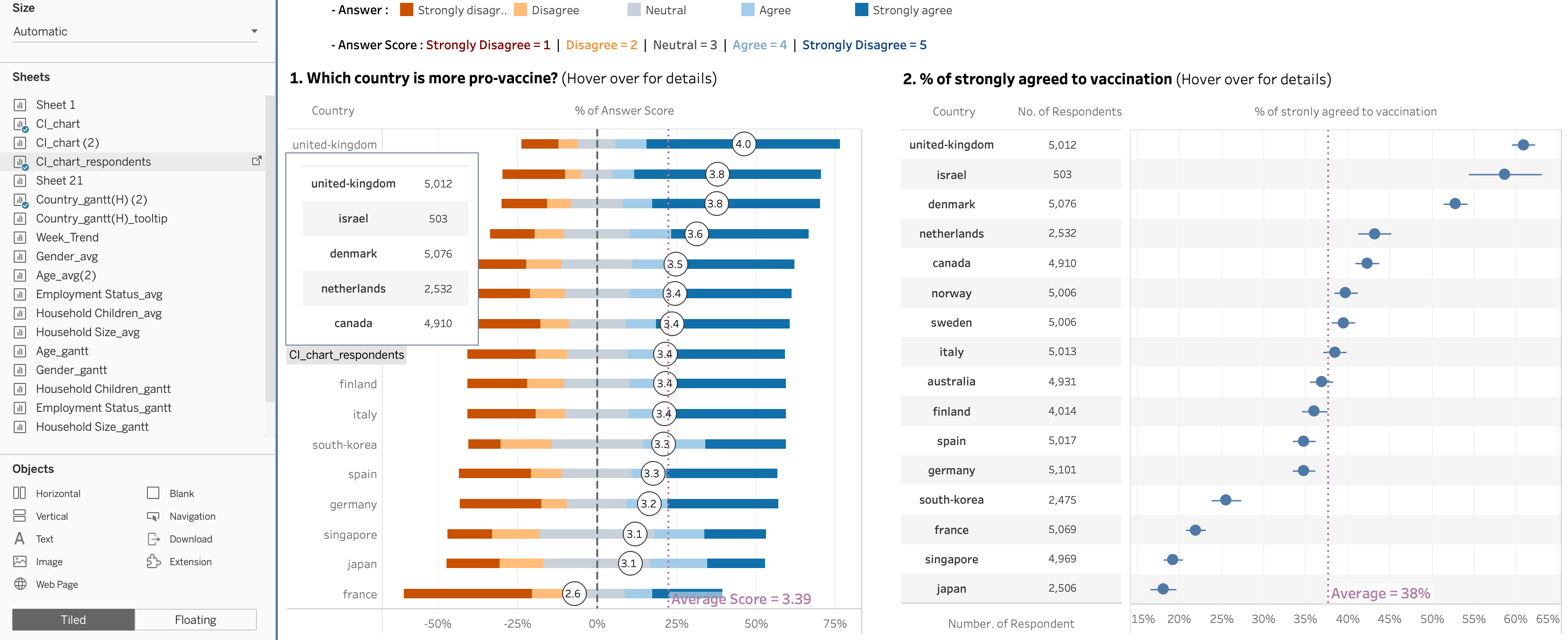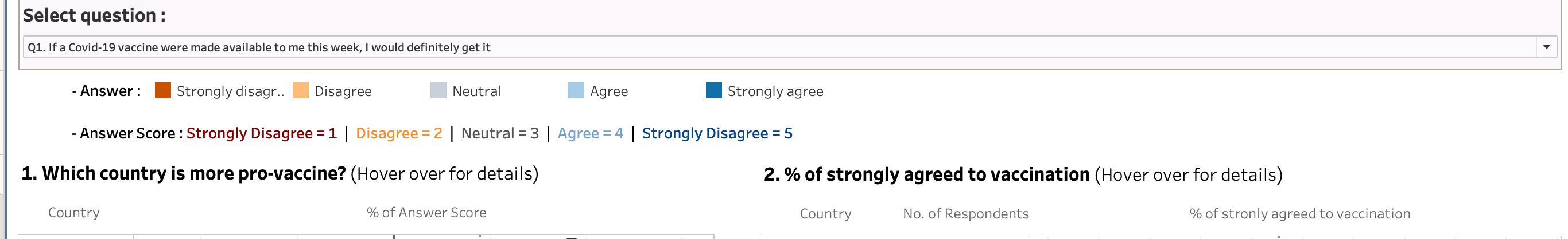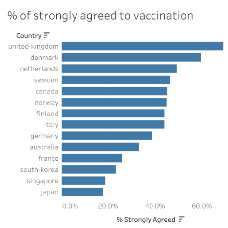 Note that in final dashboard, we will add the total number of respondents by country next to the “% of strongly agreed to vaccination” chart.