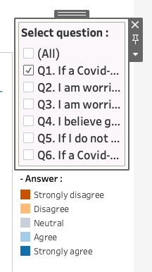 As seen below, we can put question filter upper position so that users can easily see what about the chart trying to show. Also we can locate legend of “Answer” and “Scale of answer” to show users to see easily.