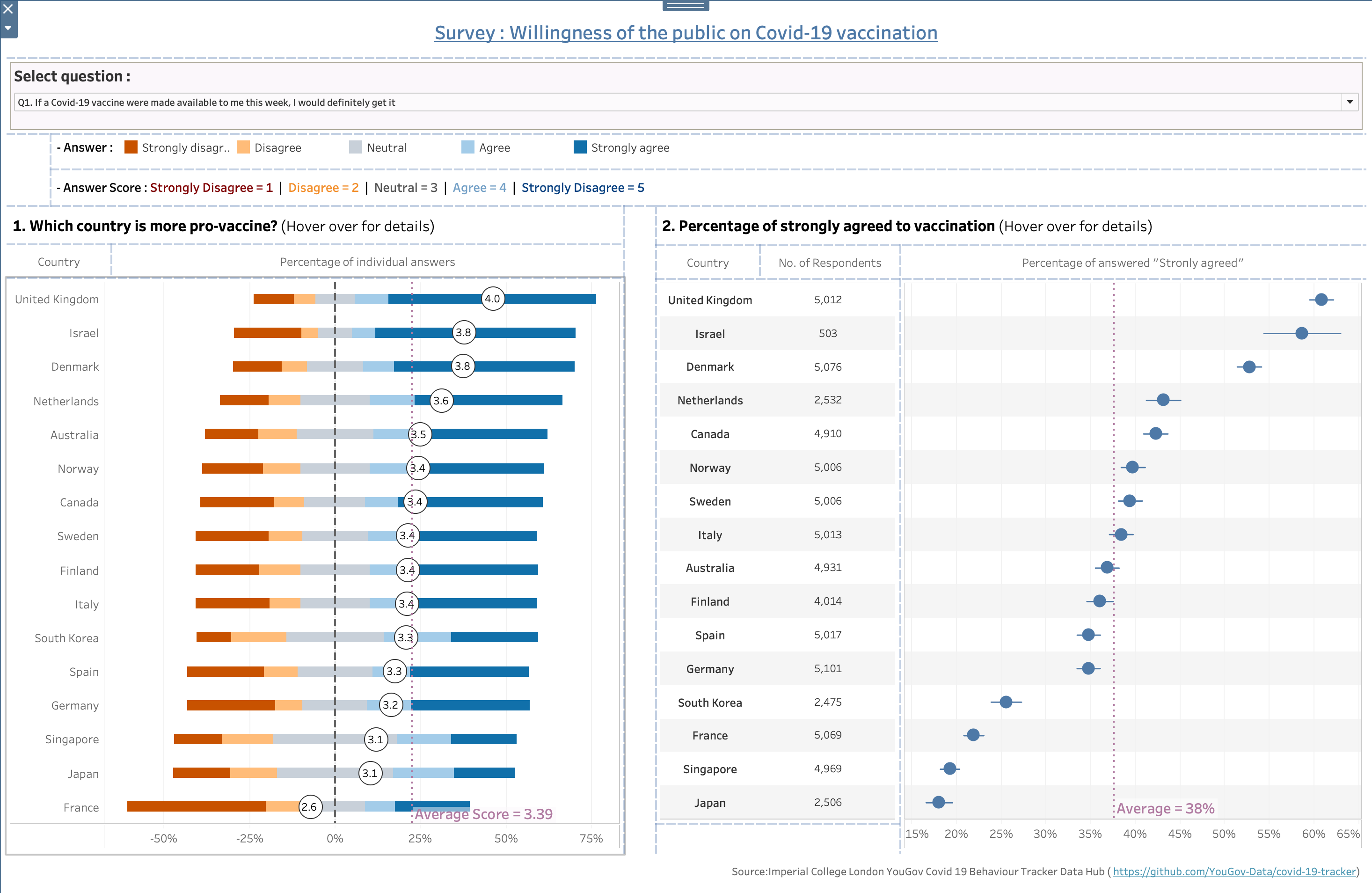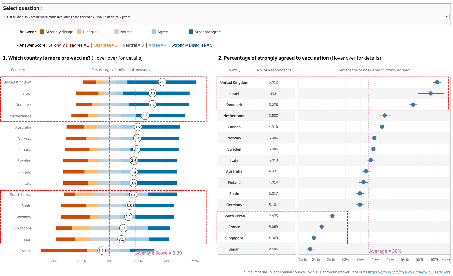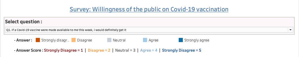 If we see below dashboard we made earlier, average scores of the survey answer to “Q1. if a Covid-19 vaccine were made available to me this week, I would definitely get it” are varied by country. If you see the charts closely, people in EU countries are more likely to get vaccine, almost above average socre value of 3.39