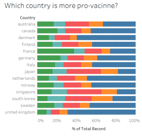 Users cannot tell which country is most pro-vaccine or not because the results are visualised using 100% stack bars. It is difficult to show using stack bars, because users should compare all the sizes and values line by line.