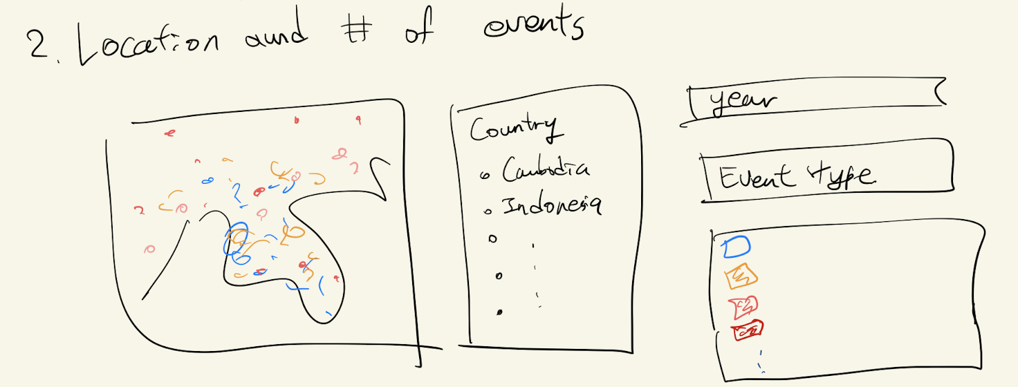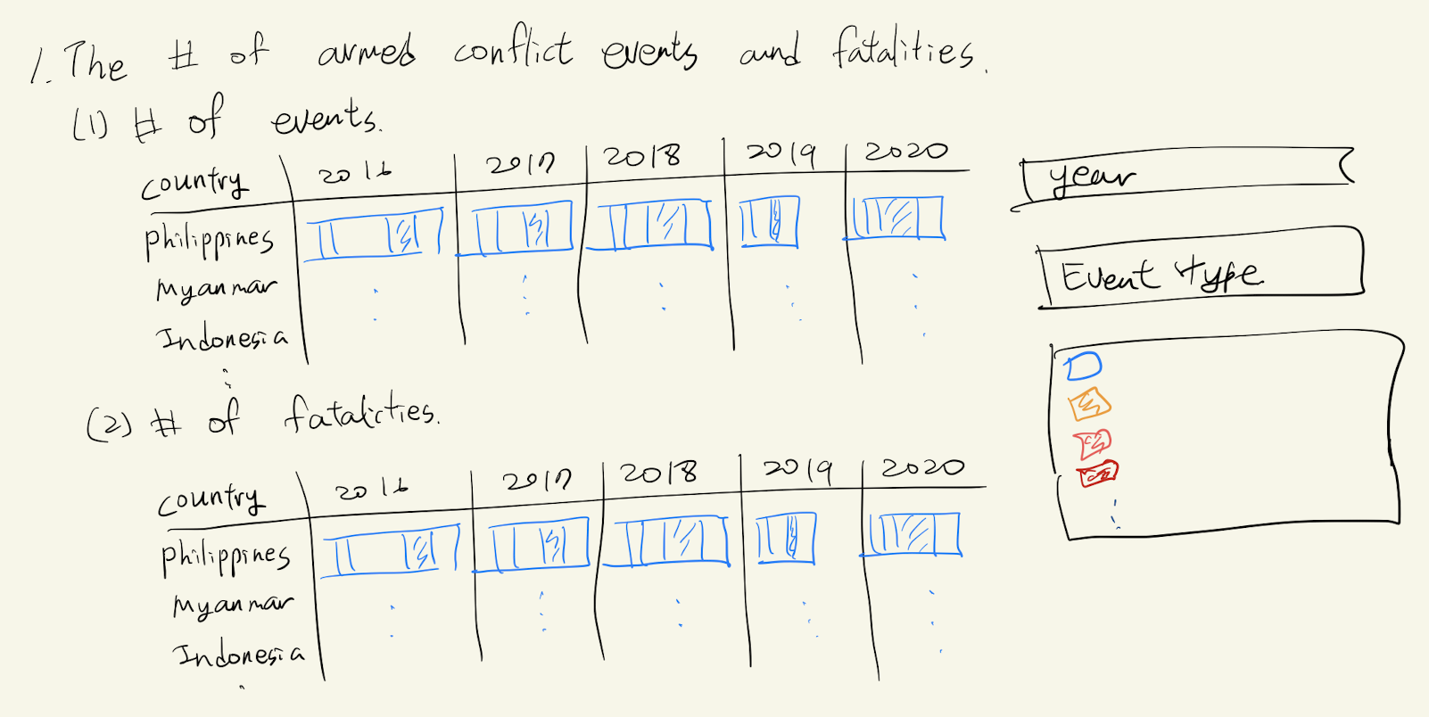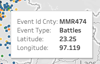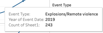 Tool tip for a line graph: When readers hover over to the line graph, only three information appeared in a form of tool tip. As described above, more valueable information should be popped up for readers. Especially, “Event Type” and “Year of Event Date” are redundant because these values can easily find in y-axis and x-axis in a graph.
