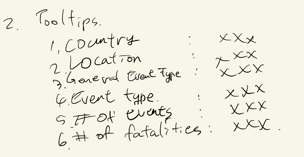 Bar charts’ tooltips: In order to show the trend of the number of events occured and fatalities, put a line graph in a tooltip function.