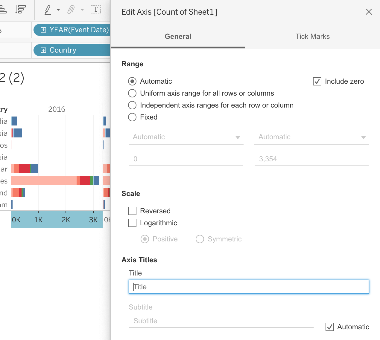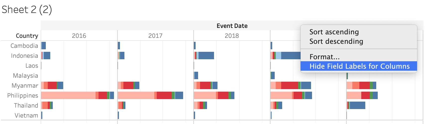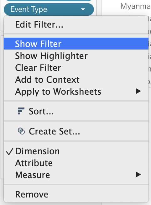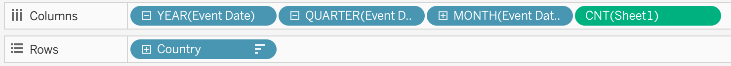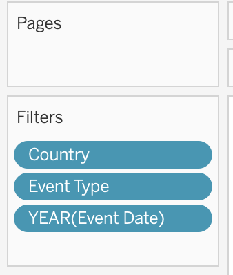 Put “Country”, “Event Tpye”, and “Year”. Then click “Show Filter” to see in the filter pannel