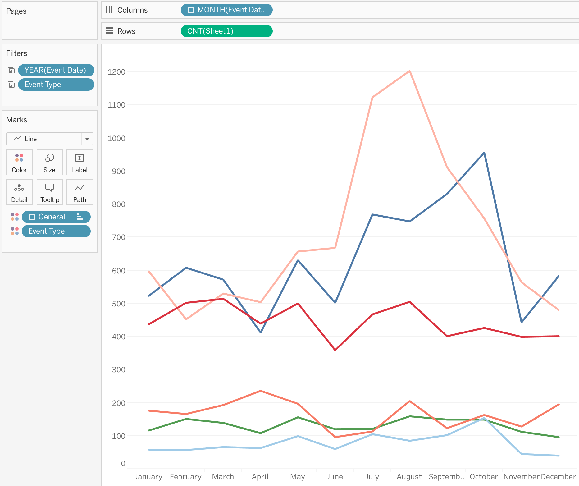 Color of line chart: As seen above, all the line graphs have the same color regardless of the event type.