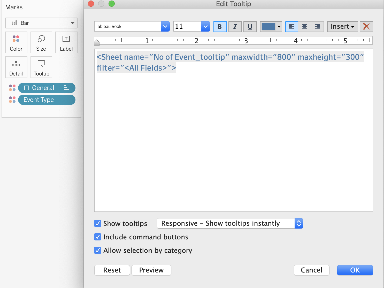 Go back to “No of Event” sheet and click “Tooltip”. Then type as below.