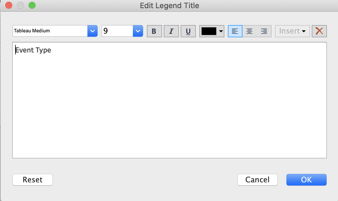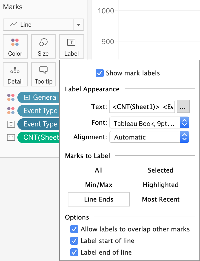 Drag and drop “Event Type” and “CNT(Sheet(1))” onto “Label” in Marks. Click “Label” button and change setting as below.