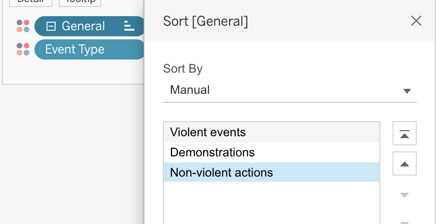 In order to show the simliar level of “Event Type”, we can paint in similar colors within the same “General type”: “Violent events”, “Demonstrations”, and “Non-violent actions”.
