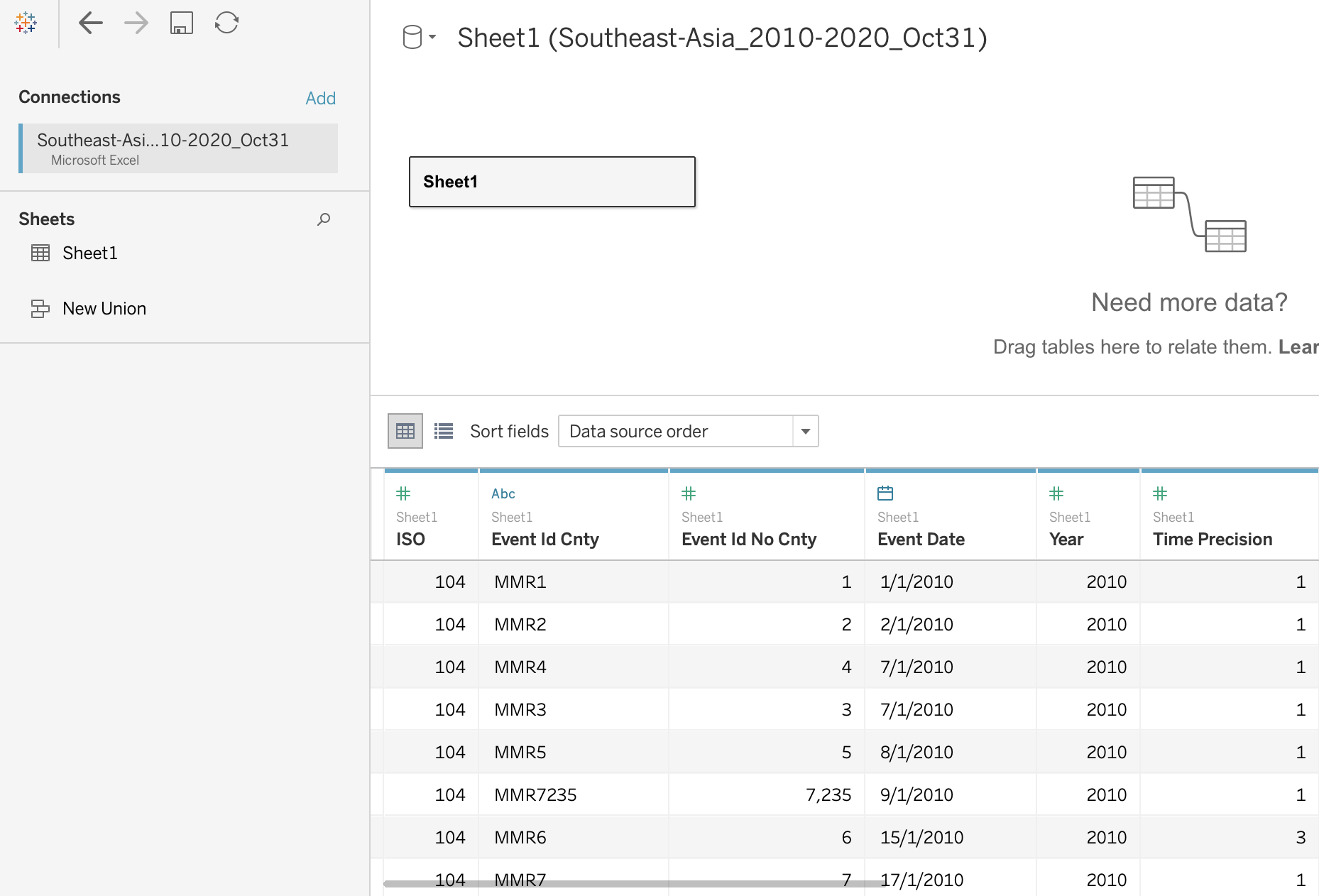 Upload raw data “Southeast-Asia_2010-2020_Oct31.xlsx” into Tableau “Data Source”.