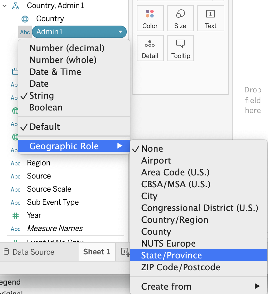 Make sure to change ’Admin1" field type to “Geographic Role” > “State/Province”.