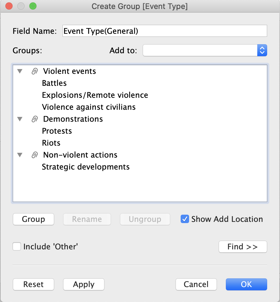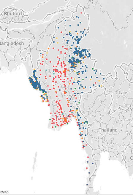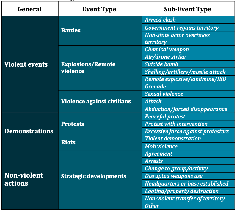 According to classification of ACLED event types in the codebook, there are three “General” categories and each category can be divided into several “Event type”. However, the original map only shows “Event Type”, without showing “General” groups. For this reason, readers cannot easily recognise the difference, in terms of severity of events.
