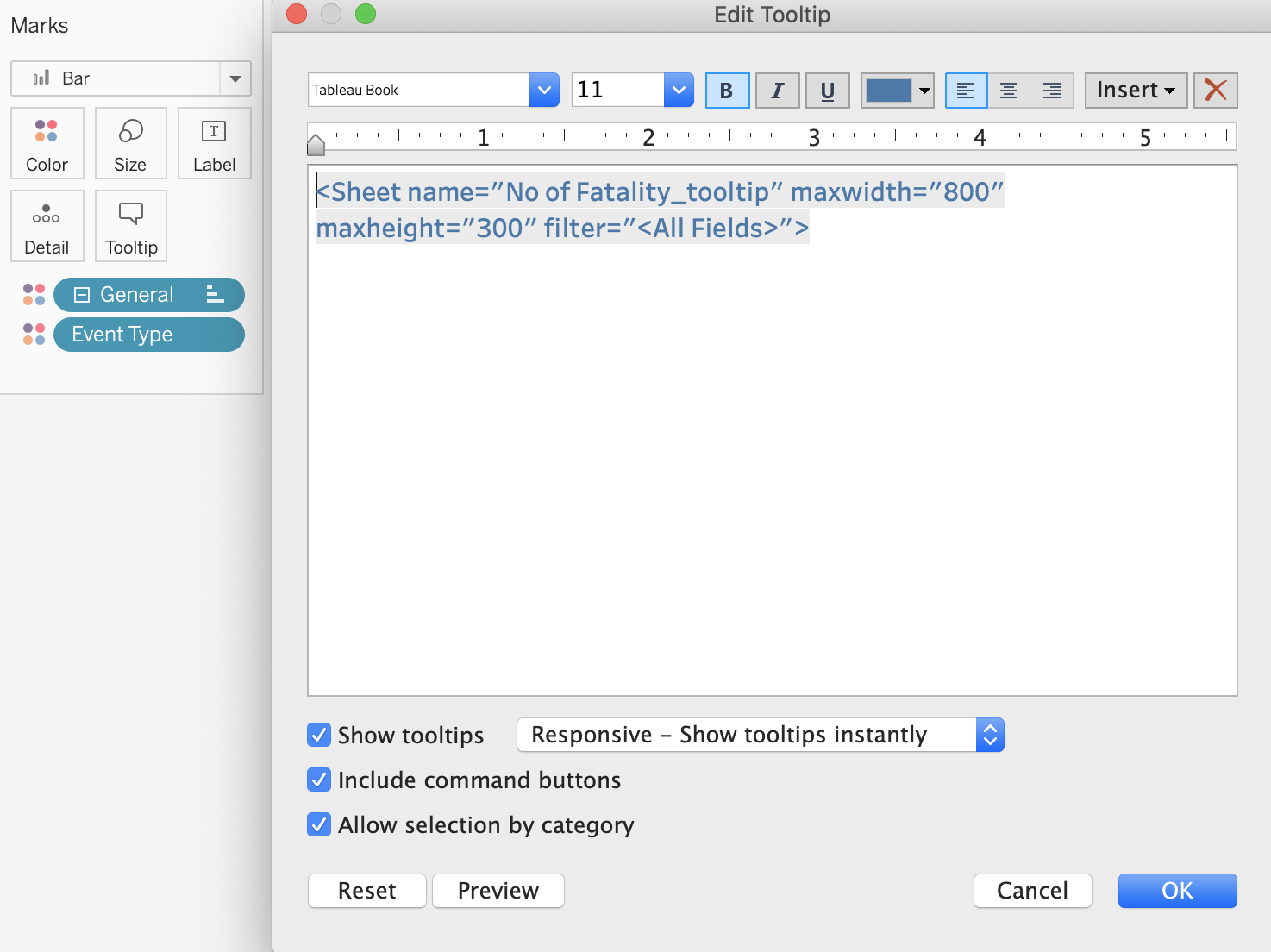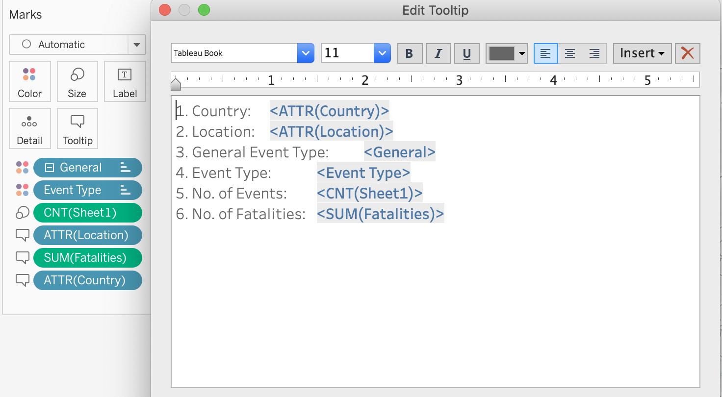 Go back to “No of Fatality” sheet and click “Tooltip”. Then type as below.