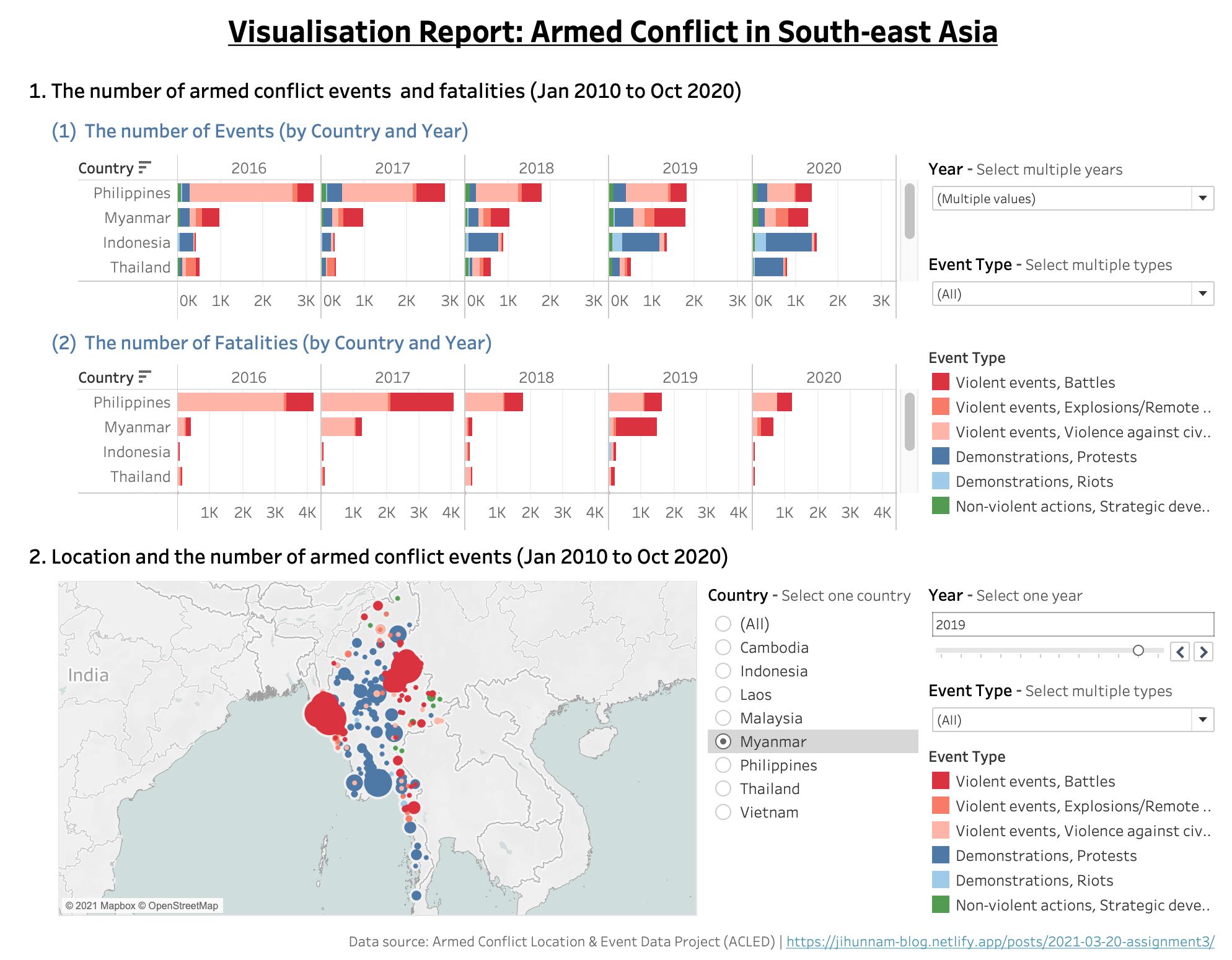This post will show how to visualise the spatio-temporal patterns of armed conflict in selected South-east Asia countries between 2015-2020. The original chart can be found at South-east Asia Armed Conflict Analysis Firstly, we will criticize the original charts then show how to make better visualization from the same data set.