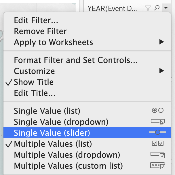 Go to “Year” legend and click small triangle right corner, then click “Single Value (slider)”