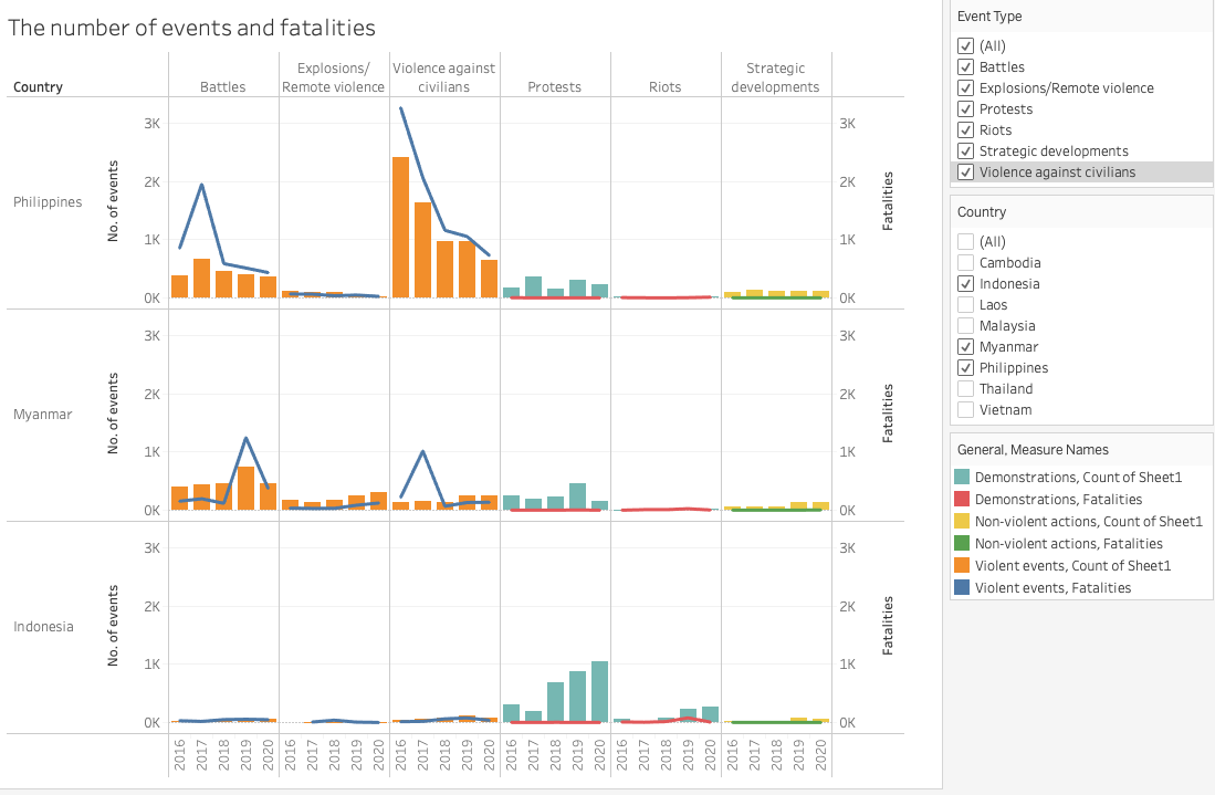 We can observe that the number of armed conflict events and fatalities changed over time. In Philippines, especially, we can see the trends decreasing over time in “Violence against civilians”. The number of fatalities was also dcreased between 2016 and 2020. However, “Protests” in Indonesia show an increasing trend from 2016 to 2020.