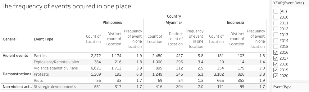 Armed conflict events have taken place in various places in each country. we want see how often events occured in one location. As seen the table below, the value can be calculated as “The number of locations events event occured” divided by “The number of locations events event occured(Distinct)”. By using the value, we can observe that “Protests” occured more frequently in the same place than other events in Philippines and Indonesia. However, in Myanmar, “Battles” occured more frequently in the same place than other events.